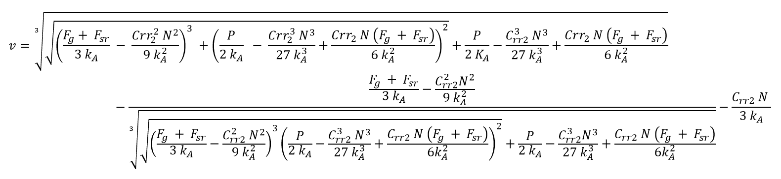 It is possible to calculate the bicycle velocity, for a given input power, by rearranging the equation for power. To do this, the resistance forces, which are dependent on velocity, must first be substituted into the power equation. Resistance forces which are not dependent on velocity may continue to be represented as individual parameters. When the resulting equation is rearranged to make velocity the subject, it becomes very complex. This means that it is of little intuitive value and it is often more useful to simply view a graph of power against velocity. However, for computational analysis it can make sense to use the equation in this form. An example is given below: