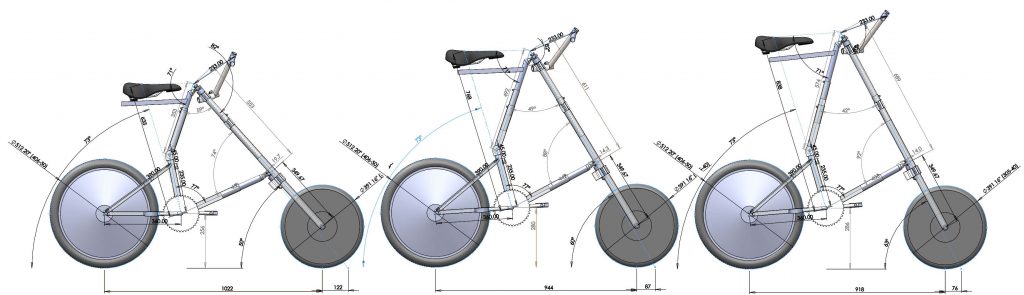 This strange-looking bicycle won’t ever enter production. It’s simply a test rig used to try different riding positions and steering geometries. When designing a folding bike, it can be easier to achieve a compact and convenient fold if you don’t stick to the conventional full-sized bicycle geometry. We will be inviting our product test group to try riding it in different configurations to see how different people feel about different riding positions. If you’d like to give it a try, you can sign-up for the test group.