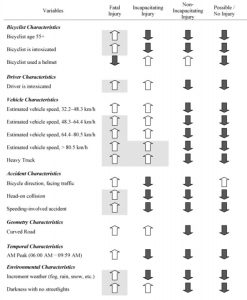 A study carried out by researchers in the USA has identified a number of factors which are strongly associated with cyclists receiving severe injuries in collisions. The most dangerous factor is motor vehicle speed. When cyclists collide with vehicles traveling at over 50 mph (80 kph) they are more than 16 times more likely to die from their injuries, when the speed is over 30 mph (48 kph) the risk is doubled. When the vehicle’s speed is less than 20 mph (32 kph) there is a greatly reduced risk of harm to the cyclist. This clearly shows the importance of avoiding high-speed traffic when cycling. Other factors which more than double the risk of death include poor weather, dark streets, morning rush hour, head-on collisions, a truck being involved, alcohol consumption by either the driver or the cyclist and the cyclist being over 55 years old.