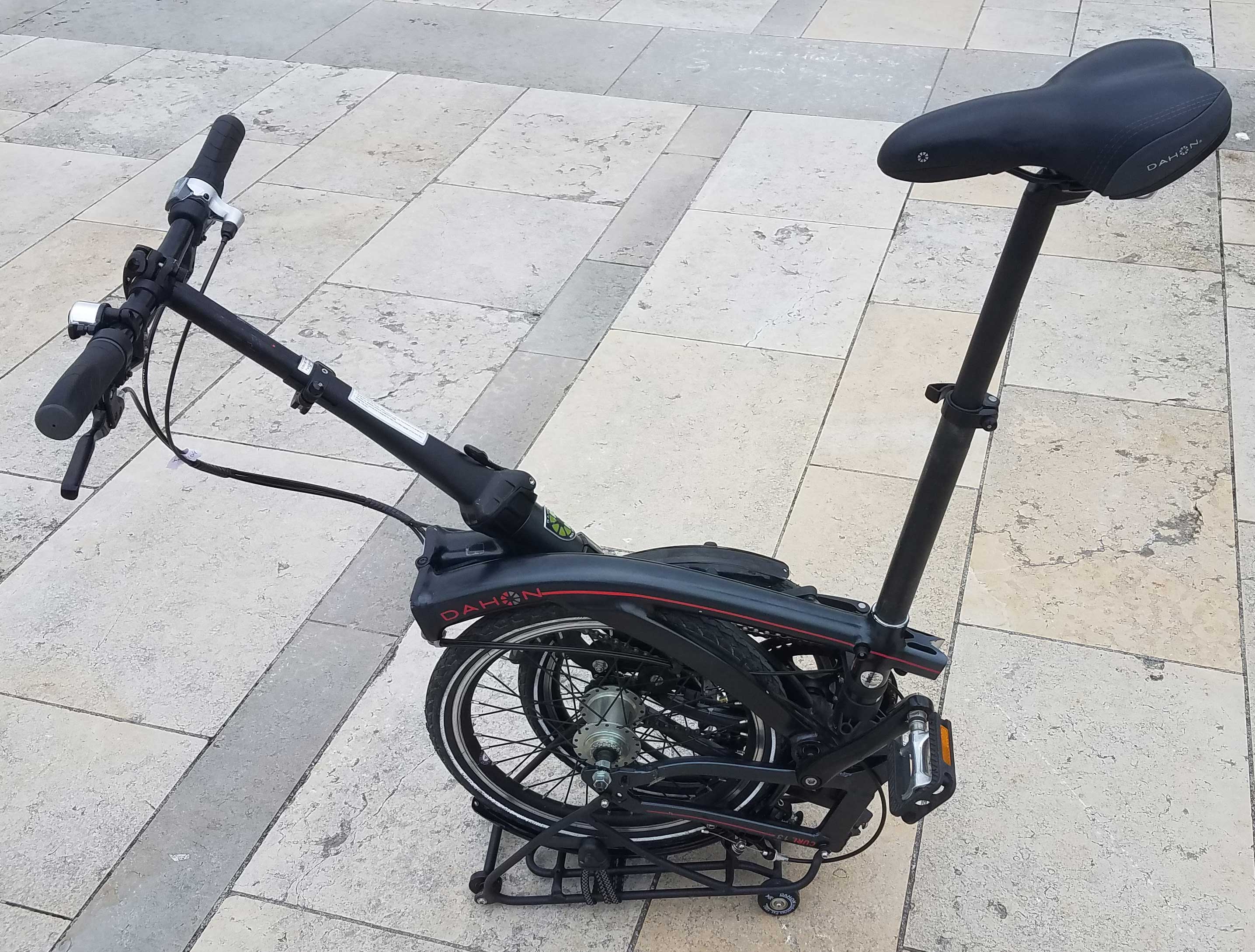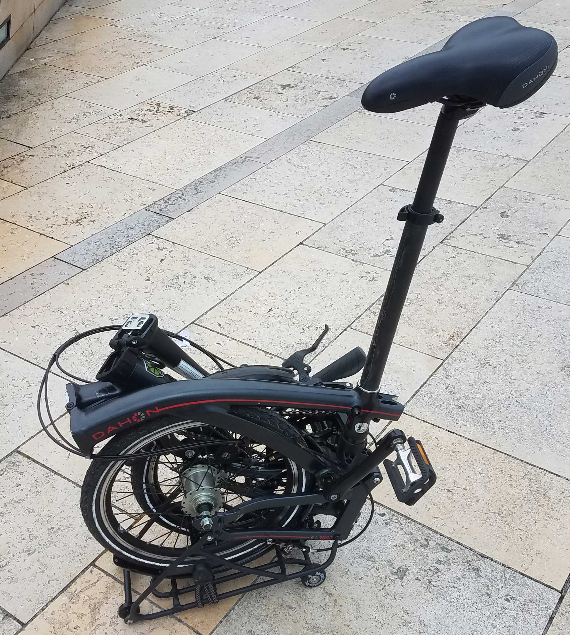 The final stage of the fold is to drop the seatpost. This locks everything into a folded package that is very compact for easy storage. The dimensions of the Dahon Curl when folded are 580 mm x 545 mm x 280 mm. Although the folded bike is slightly longer than a Brompton, it is also a little lower. The volume is the same for both bikes, 89 liters.